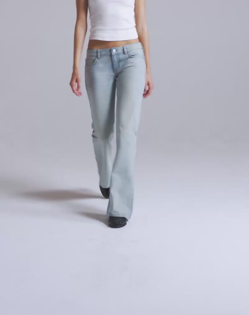 En un lavado azul brisa, nuestros vaqueros de tiro extra bajo presentan un corte acampanado con cierre de cremallera y botón, dobladillo limpio, detalle de 5 bolsillos y lengüeta trasera, botón y remaches con la marca. Combínalos con nuestra Top de manga larga Dulcet.