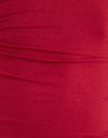 Vestido Laluma en tejido de punto de rayón negro. De largo midi, escote en pico y diseño sin mangas. Se completa con una cintura fruncida que cae en cascada hasta un dobladillo vaporoso.
